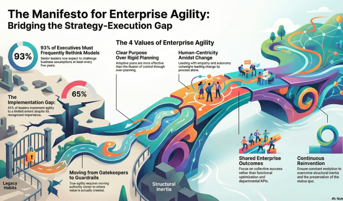 From intention to impact, enterprise agility is the bridge that turns strategy into coordinated action, enabling organisations to overcome legacy barriers, close execution gaps, and continuously reinvent for a fast changing world.