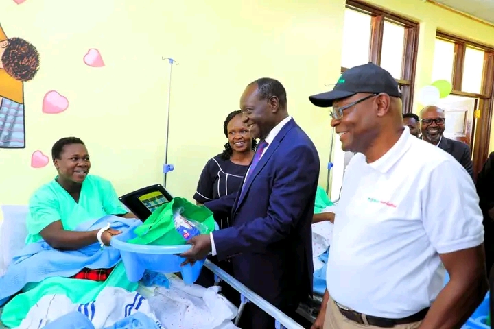 Vihiga Governor Wilber Ottichilo (in suit), alongside M-Pesa Foundation CEO Joseph Ogutu, visits a mother who had safely delivered at the newly established facility, marking a moment of hope and improved maternal care in the county. PHOTO/Martin Ombima, Scholar Media Africa.